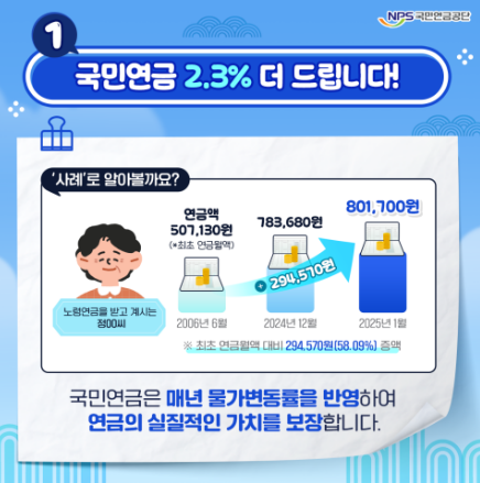올해 1월에도 전년도 물가변동률을 반영하여 국민연금 급여액*이 2.3% 인상됩니다.